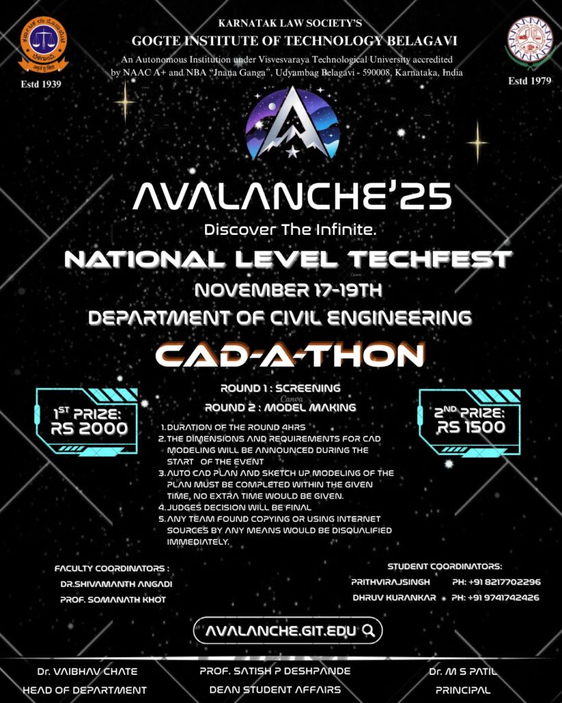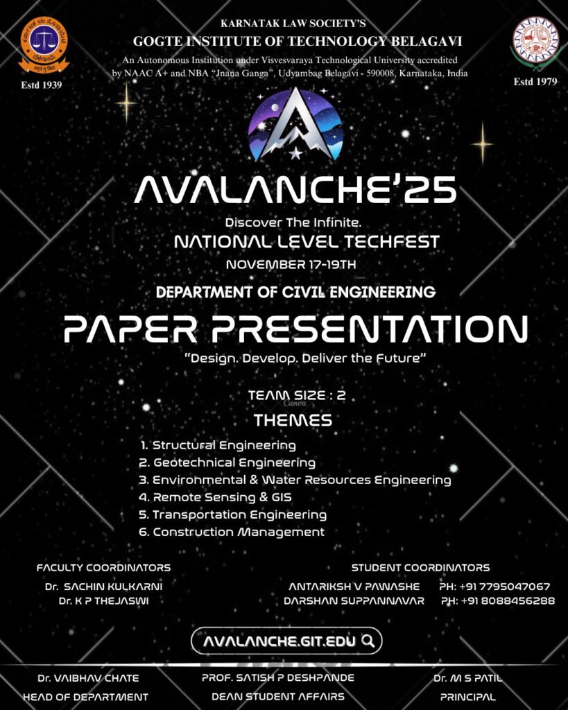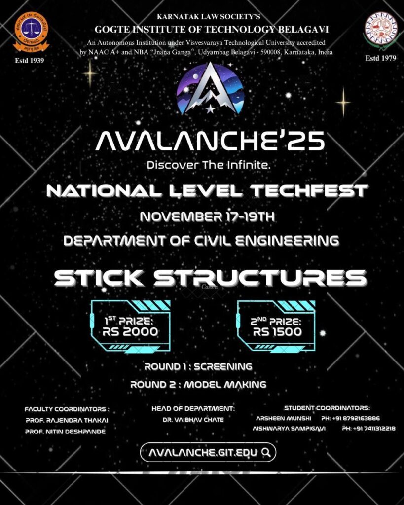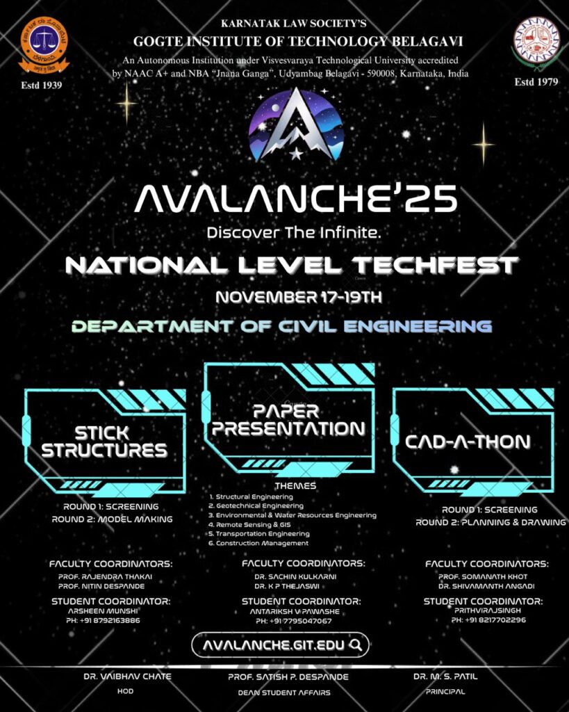 Industrial Visit to Bengaluru March 2, 2026 Read more November 11, 2025 Activities AVALANCHE’25 Read more November 11, 2025 Activities AVALANCHE’25 Read more November 11, 2025 Activities, Uncategorized AVALANCHE’25 Read more November 11, 2025 Activities AVALANCHE’25 Read more October 30, 2025 Activities Placement -2025 Read more October 6, 2025 Activities WORLD HABITAT DAY Read more July 22, 2025 Activities Field visit “ Bridge and Flyover along NH48” Read more July 21, 2025 Activities GIT Submits Critical Safety Report on Bedekollamath Black Spot to the Commissioner of Belagavi Read more July 9, 2025 Activities, Events Technical Talk on “Need for Construction Chemicals in Structure” for students and faculties Read more Previous Page1 Page2 Page3 Page4 Page5 Next