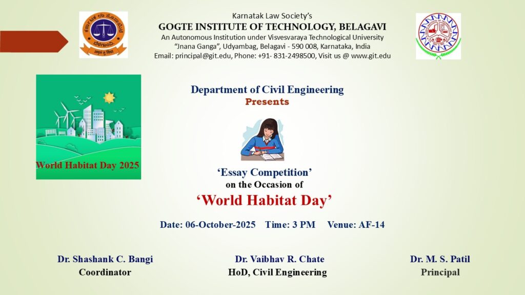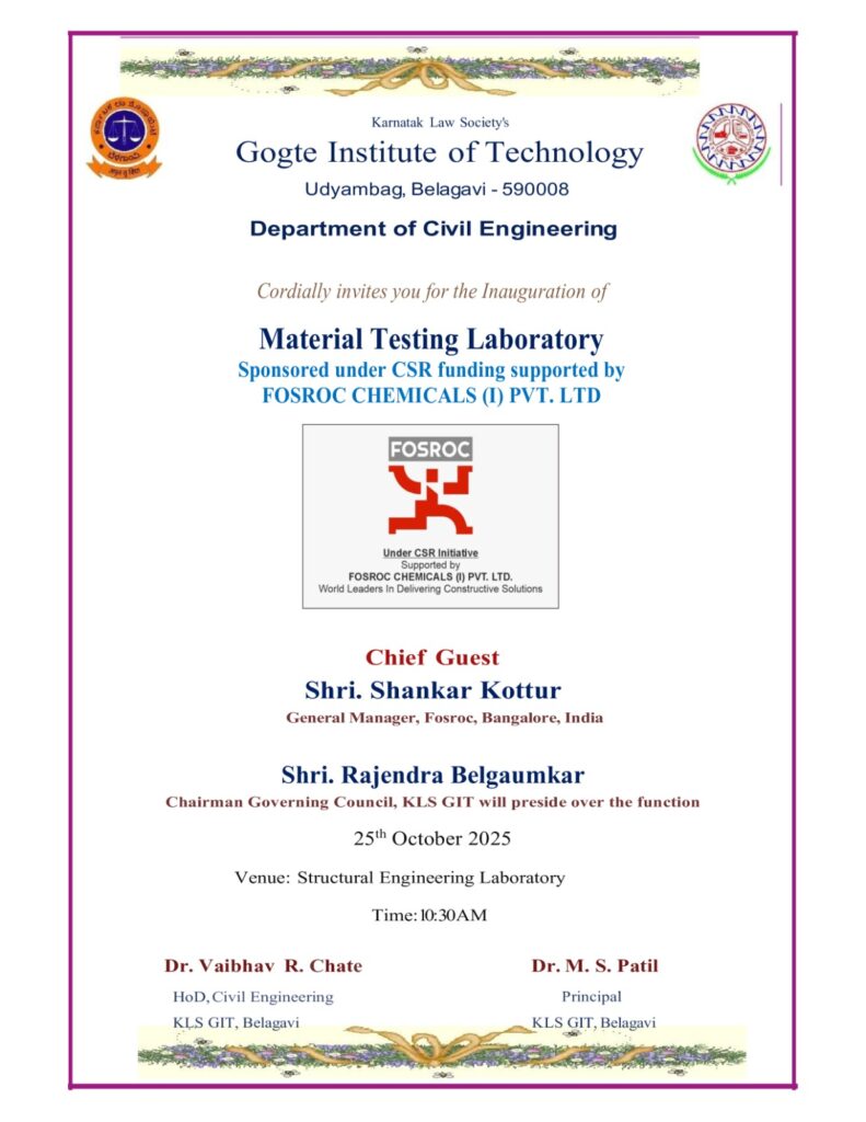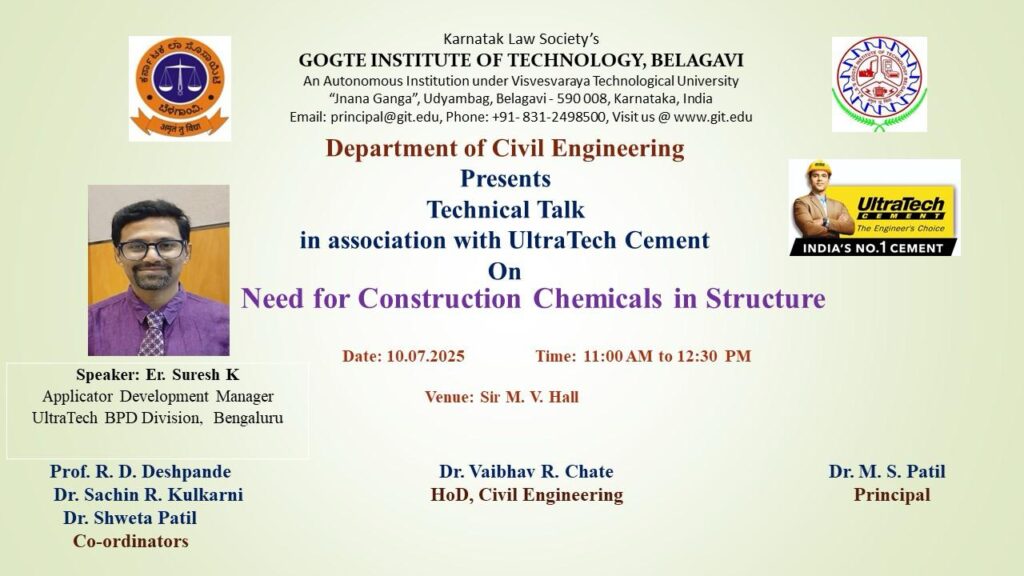 Technical Talk on “Design and Construction of World’s Highest Railway Bridge ” December 1, 2025 Read more November 27, 2025 Activities Glimpses of 9th Graduation Day celebration Read more November 27, 2025 Events 9th GRADUATION DAY OF CIVIL ENGINEERING DEPARTMENT Read more October 23, 2025 Events Inauguration of Material testing Laboratory Read more October 6, 2025 Activities WORLD HABITAT DAY Read more July 9, 2025 Activities, Events Technical Talk on “Need for Construction Chemicals in Structure” for students and faculties Read more May 21, 2025 Activities, Events Engineering Courses Awareness Program Read more March 11, 2025 Uncategorized IGBC’s Certification Course on “Green Built environment” Read more March 5, 2025 Uncategorized Five Days FDP on “Building Information Modelling (BIM)” Read more December 16, 2024 Uncategorized Student’s Project Exhibition-2024-25 Read more Previous Page1 Page2 Next