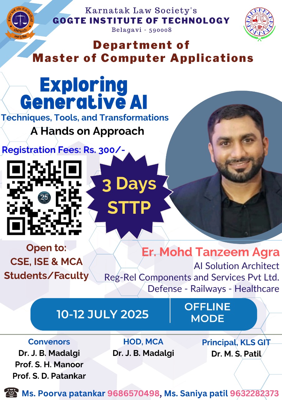 A three Day STTP on “A hands on Approach on exploring Generative AI , Techniques,Tools and Transformation” From 10th to 12 July.