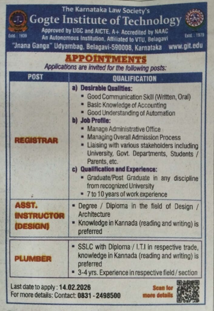 Eligible candidates may submit the application in hard copy as per the prescribed format to The Principal, KLS Gogte Institute of Technology, Udyambag, Belagavi 590008 along with all relevant documents.